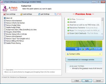 Realizar modificações no seu MSN de sempre é simples. Basta marcar as caixas de seleção correspondentes no A-Patch. Para facilitar mais ainda o processo o A-Patch traz uma área de pré-visualização que mostra como vai ficar seu Windows Live Messenger depois de confirmar as mudanças.